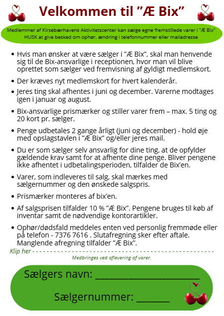 Alle medlemmer af Kirsebærhaven kan blive oprettet som sælger i "Æ Bix". Retningslinier for sælgere kan ses nedenfor.