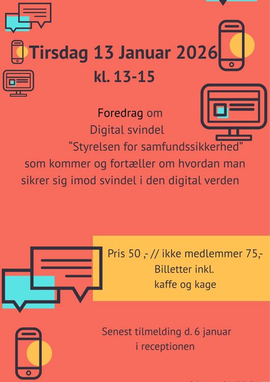 Foredrag om digital svindel Få inspiration til at undgå digital svindel. Oversigt 13. jan. 2026 13:00 -15:00 50,- kr. for medlemme. 75,- kr. for ikke medlemmer.