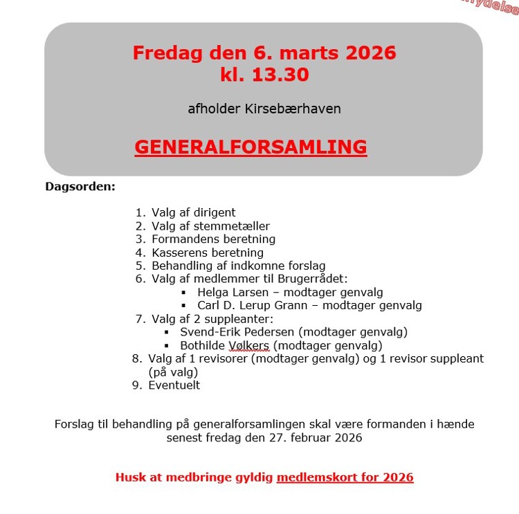 Generalforsamling i Kirsebærhaven Mød op til generalforsamlingen og deltag i beslutningsprocessen. Generalforsamling i Kirsebærhaven 06. mar. 2026 13:30