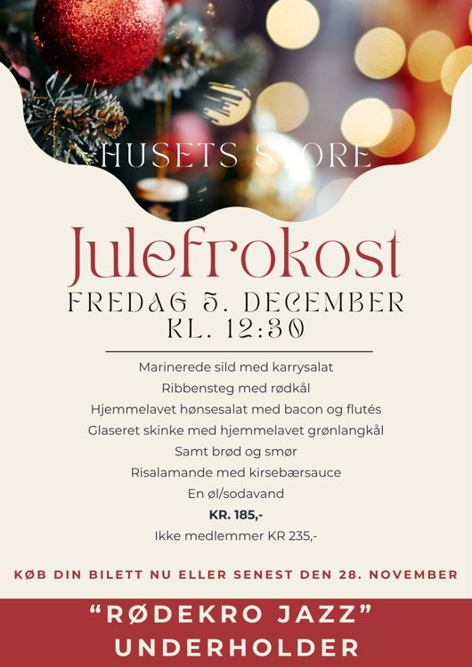 Julefrokost 2025 Kom og vær med til en hyggelig og velsmagende julefrokost. Julefrokost 2025 05. dec. 2025 12:30 185,- for medlemmer. 235,- kr. for ikke medlemmer.