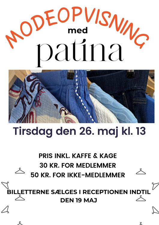 Tilmelding i receptionen indtil 19. maj 2026 Modeopvisning med patina ALLE er velkommen Vi ses til en hyggelig eftermiddag. Oversigt 26. maj 2026 13:00 -16:00 Pris incl. kaffe og kage - 30 kr. for medlemmer - 50 kr. for IKKE-medlemmer