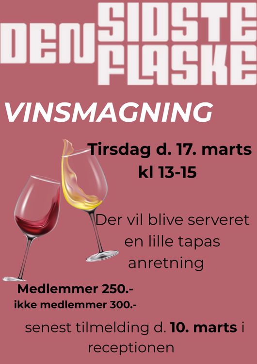 Kom til Vinsmagning i Kirsebærhaven, hvor du får mulighed for at smage nogle forskellige vine sammen med en lille Tapas-anretning
