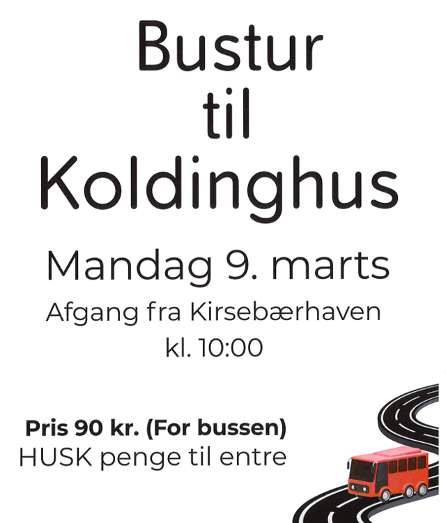 Tilmelding senest 5. marts 2026 Bustur til Koldinghus OBS - KUN FOR MEDLEMMER Koldinghus Oversigt 09. mar. 2026 10:00 For medlemmer - 90 kr.